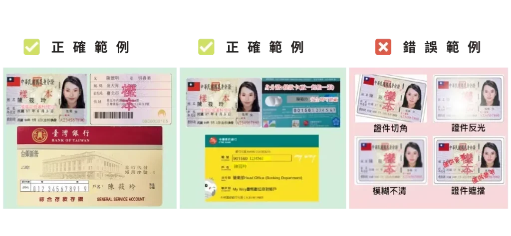 - 必須維持文件的完整性,不能有切邊或切角、模糊不清、反光以及遮住個人資料,綁定銀行帳戶須提供一張實體存摺影本、身分證正反面影本各一張,共三張。